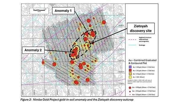 Follow-up work has identified a gold-in-soil anomaly covering a northeast-trending area approximately 5.7 km by 1 km, suggesting potential for a sizeable system. In addition, artisanal gold mining activity within the anomaly is consistent with the presence of an underlying hard-rock gold system. The scale of the anomaly suggests the mineralized system may extend well beyond the initial discovery area.