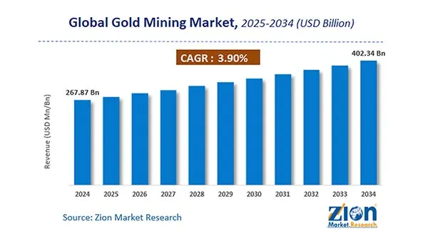 The global gold mining market was valued at $267.9B in 2024 and is projected to reach $402.3B by 2034, implying a 3.9% CAGR over the forecast period6.